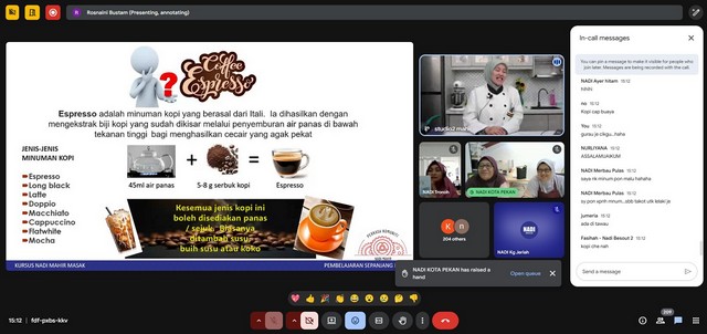 15 Ogos 2025 | Aktiviti TerkiniPada 14 Ogos 2025 (Khamis), telah diadakan kelas NADI Mahir Masak untuk minggu yang keempat. Kelas ini telah disertai oleh seorang peserta dari NADI Kampung Jeriah. Kelas diadakan secara atas talian bermula pada pukul 3:00 petang sehingga pukul 4:30 petang.